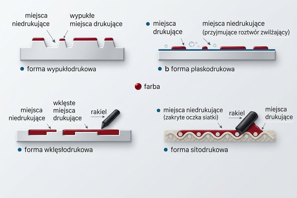Zasada: elementy drukujące są wyniesione ponad powierzchnię, a farba pokrywa tylko te wypukłe części.